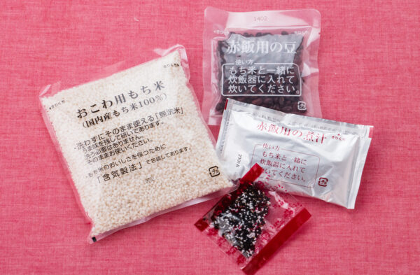 「らくらく炊きたて赤飯おこわ」は、こだわりの無洗米もち米(2合分) 、下ごしらえした豆、豆から作った自然な色合いの煮汁、ごま塩がセットになっています。