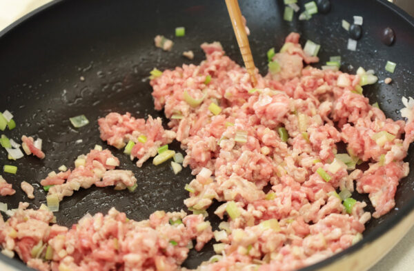 フライパンに油を熱し、にんにく、しょうが、長ねぎを炒め、香りが立ったら、ひき肉を加えて色が変わるまで炒める。