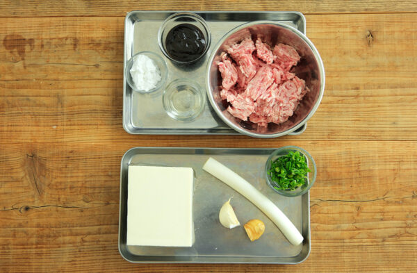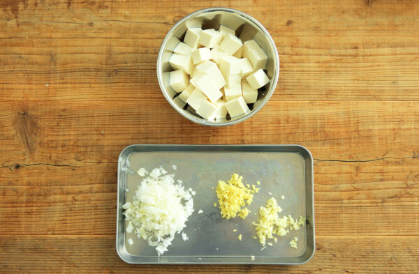 木綿豆腐は一口大の角切りにする。にんにく、しょうが、長ねぎはみじん切りにする。