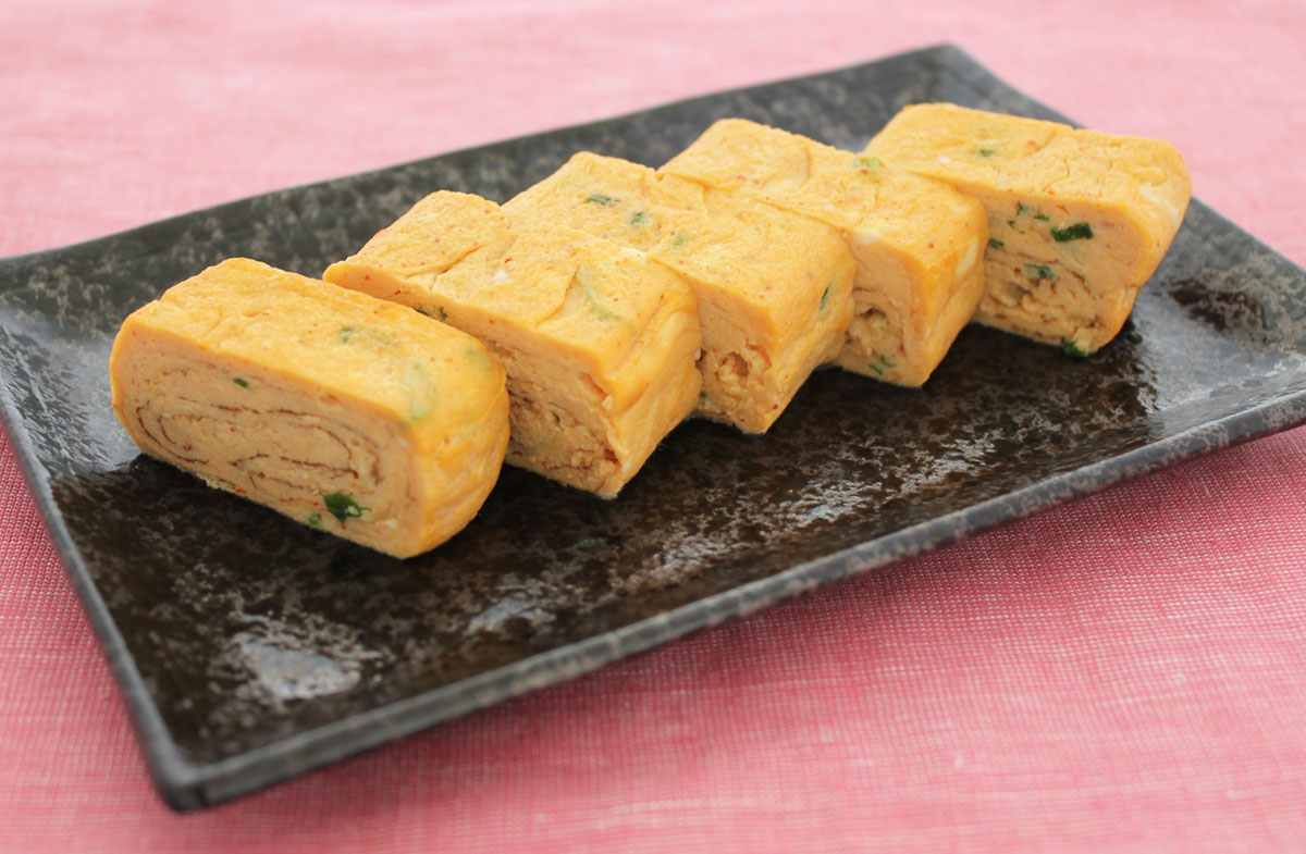 玉子焼き器に油をひいて中火で熱し、(2)を2~3回に分けて流し入れ、端から巻く。