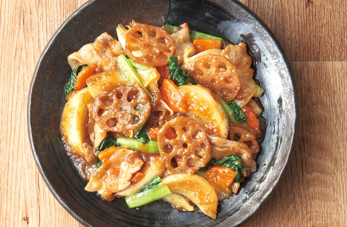 3種のゴロゴロ具入りの簡便調味料です。豚肉、玉ねぎを加えてフライパンで8分炒めるだけ。甘辛いしょうゆ味。