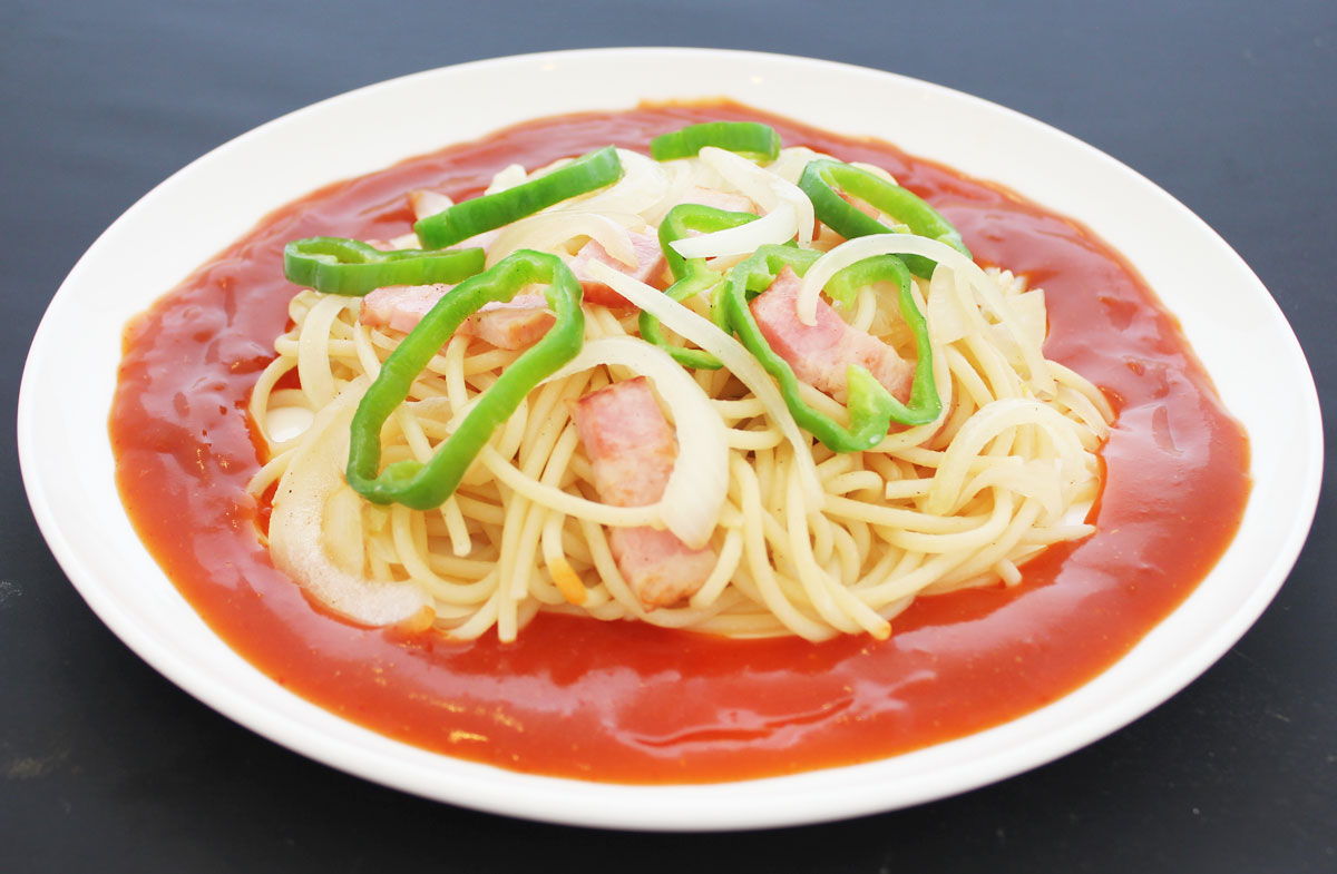 フライパンに油を熱し、玉ねぎ、ピーマン、ベーコンを炒める。さらにスパゲティを加えて炒める。