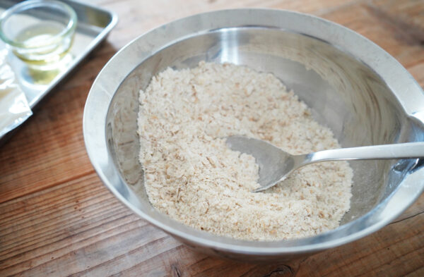 オートミール、薄力粉、アーモンドプードルをボウルに入れて軽く混ぜ合わせる。