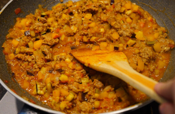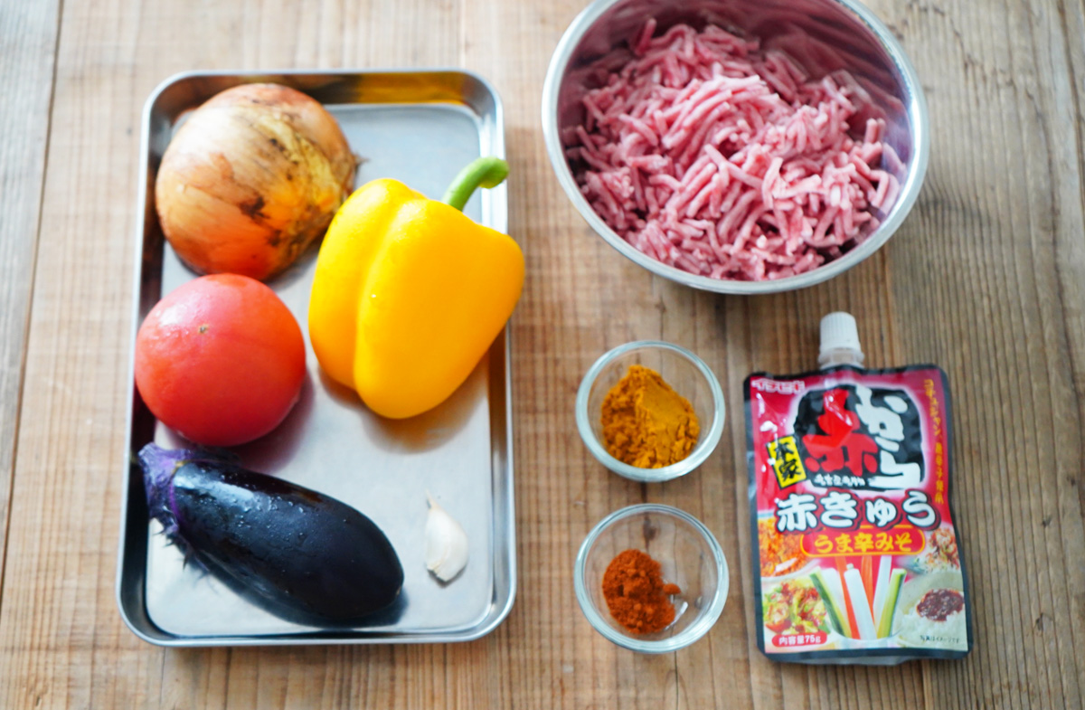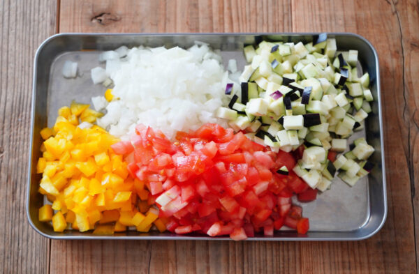 トマト、パプリカ、玉ねぎ、なすは1cm角程度に切る。にんにくはみじん切りにする。
