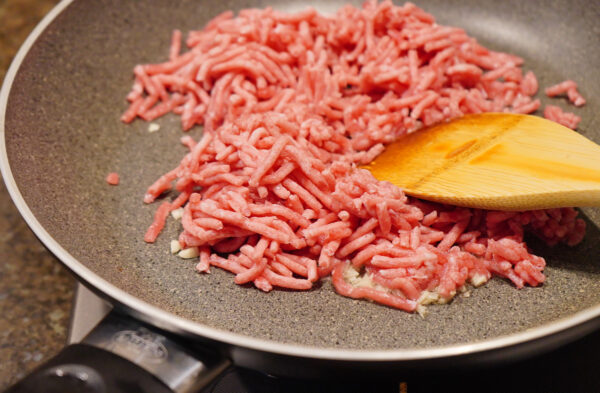 フライパンに油、にんにくを入れて加熱し、にんにくの香りがしてきたら豚挽き肉を加えて色が変わるまで炒める。