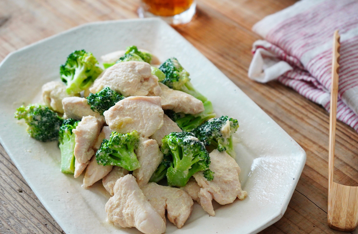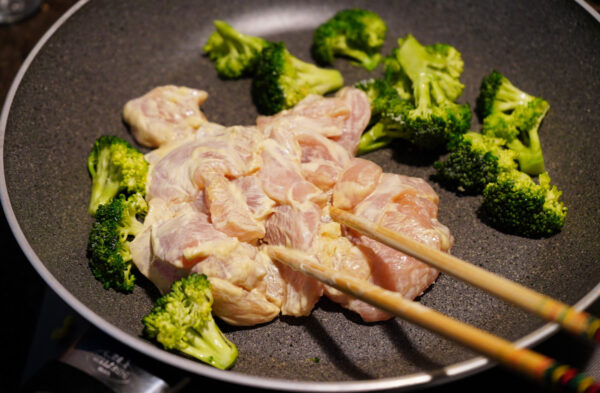 フライパンに油を熱し、鶏肉とブロッコリーを弱~中火で鶏肉に火が通り水気がなくなるまで炒める。