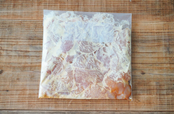 ジッパー付きポリ袋に鶏肉、にんにく、Aを入れてもみ込み、空気を抜いて密封する。