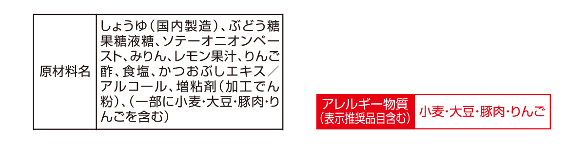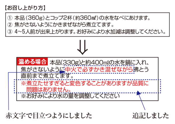 表示法に従った原材料名への表示に加え、枠外にも目立つように順次表示していきます。