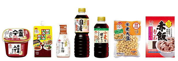 赤だし750g、ミックス750g、カップ名古屋八丁赤だし500g、だし入りみそ750g(赤だし、あわせ)、無添加生みそ750g(赤だし、あわせ、こうじ)、献立いろいろみそ(450g、300g)、本醸造しょうゆ(800ml、1.8l)、無添加国産しょうゆ800ml、小麦を使わない丸大豆しょうゆ500ml、卓上生さしみ溜200ml、つゆの素1l、献立いろいろつゆ600ml、国産水煮大豆155g、らくらく炊きたて赤飯おこわ、らくらく炊きたて赤飯小豆おこわ