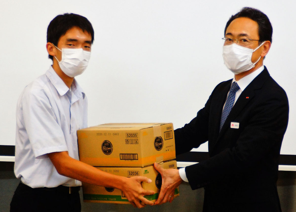 イチビキは、2020年9月3日(木)に岐阜県立岐阜商業高等学校(以下、県立岐阜商業)を訪問し、運動部の代表生徒にイチビキが製造するあま酒製品「糀time」を1200個提供しました。