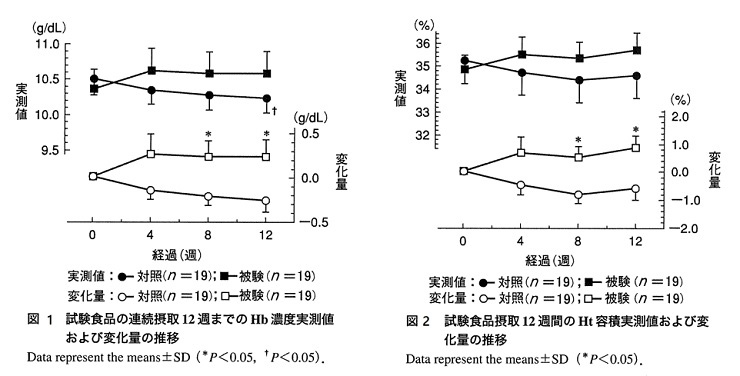 蔵華乳酸菌LTK-1を摂取したグループではプラセボグループと比較して血中のHbおよびHtが有意に改善しました。