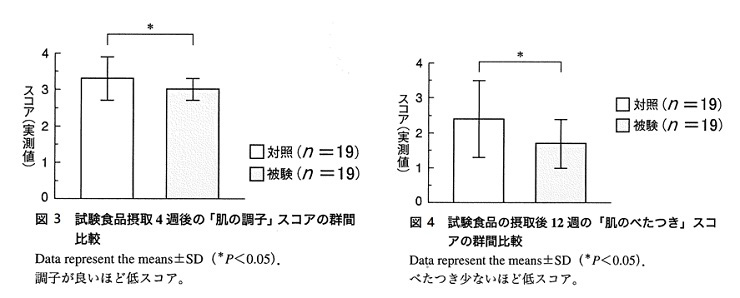 アンケートの結果、「肌の調子」や「肌のべたつき」に対して蔵華乳酸菌LTK-1を摂取したグループはプラセボグループと比較してスコアが改善しました。(図3、図4)