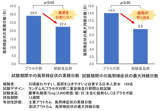 本研究に用いた蔵華乳酸菌LTK-1(菌株名Tetragenococcus halophilus No.1)は加工や保存、体内の消化液の影響を受けず、安定的に腸まで届く加熱殺菌菌体です。本研究では1日75mg(3,000億個)の蔵華乳酸菌LTK-1の継続摂取により、日頃疲れやすく風邪を引きやすい健常な日本人男女において、「風邪を引きにくくなる」、「風邪が早く治る」ことが確認されました。