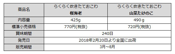 - 国内産もち米(無洗米)付きで、根強い人気を誇る「らくらく炊きたておこわ」シリーズから、季節限定の新商品を発売することでシリーズ全体の活性化を狙います。