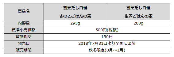 イチビキ株式会社(本社:愛知県名古屋市、代表取締役社長:中村光一郎)は、鰹厚削り節で炊く「割烹だし自慢」シリーズから、期間限定で《きのこごはんの素》《生姜ごはんの素》を発売し、2018年7月31日より全国へ出荷いたします。