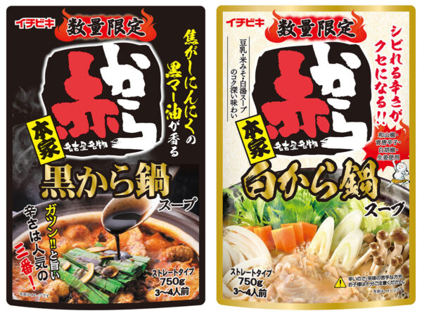 イチビキ株式会社(本社:愛知県名古屋市、代表取締役社長:中村光一郎)は、“辛さを極めたやみつきの旨さ”で大人気の「赤から」シリーズから《ストレート黒から鍋スープ》《ストレート白から鍋スープ》を数量限定で2019年10月21日より全国へ出荷いたします。