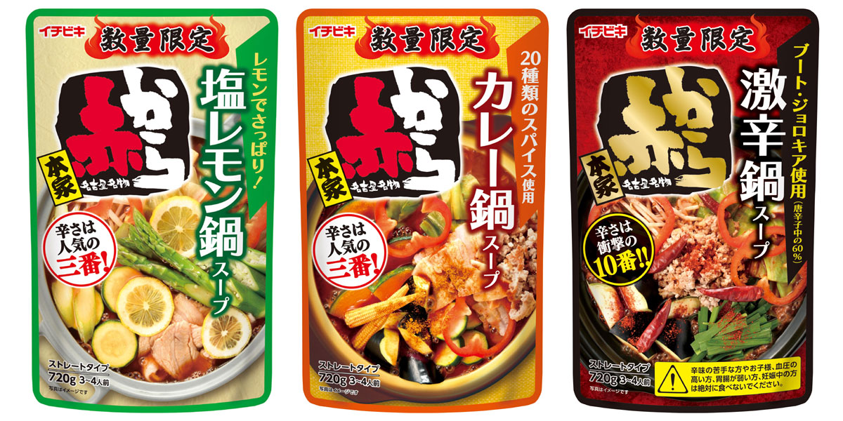 赤から鍋は、外食店「赤から」の看板メニューです。イチビキでは、2008年からご家庭でお店の味を楽しめる「赤から鍋スープ」を販売しています。赤から鍋数量限定品は、2017年の『赤から鍋スープ15番』以降、毎年様々なフレーバーを発売し、多くの赤からファンの皆様から好評をいただいています。今シーズンは、人気の『赤から鍋スープ三番』をベースにした『赤からカレー鍋スープ』『赤から塩レモン鍋スープ』、ブート・ジョロキアを使用した辛さ10番相当の『赤から激辛鍋スープ』を新パッケージで発売し、夏の赤から鍋スープの需要拡大を目指します。